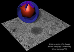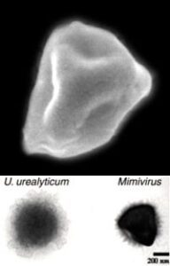 Il mimivirus è stato indicato quale possibile “anello mancante” tra virus e cellule viventi: fu scoperto casualmente da ricercatori francesi nel 1992 e la sua natura di virus è stata confermata solo nel 2003. Si avvicina alle dimensioni di un batterio e ha un diametro di mezzo micron, circa 10 volte quello del virus della comune influenza. Esso infetta le amebe, ma si ritiene possa rappresentare un agente patogeno anche nell’essere umano, poiché sono stati scoperti alcuni anticorpi controdi esso nei pazienti affetti da polmonite.