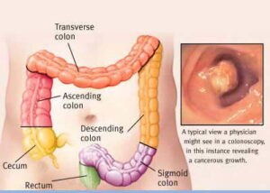 descrizione del tratto colon-rettale e colonscopia che rivela una crescita cancerosa