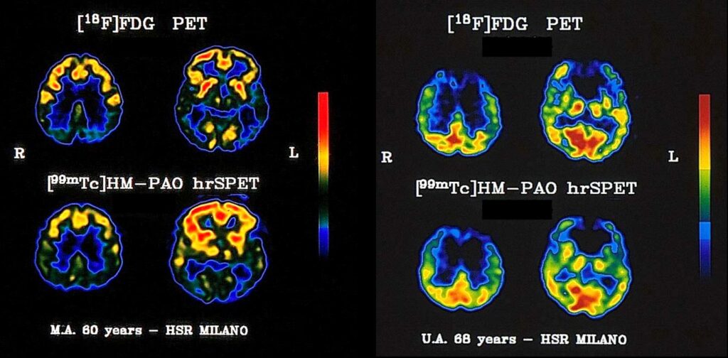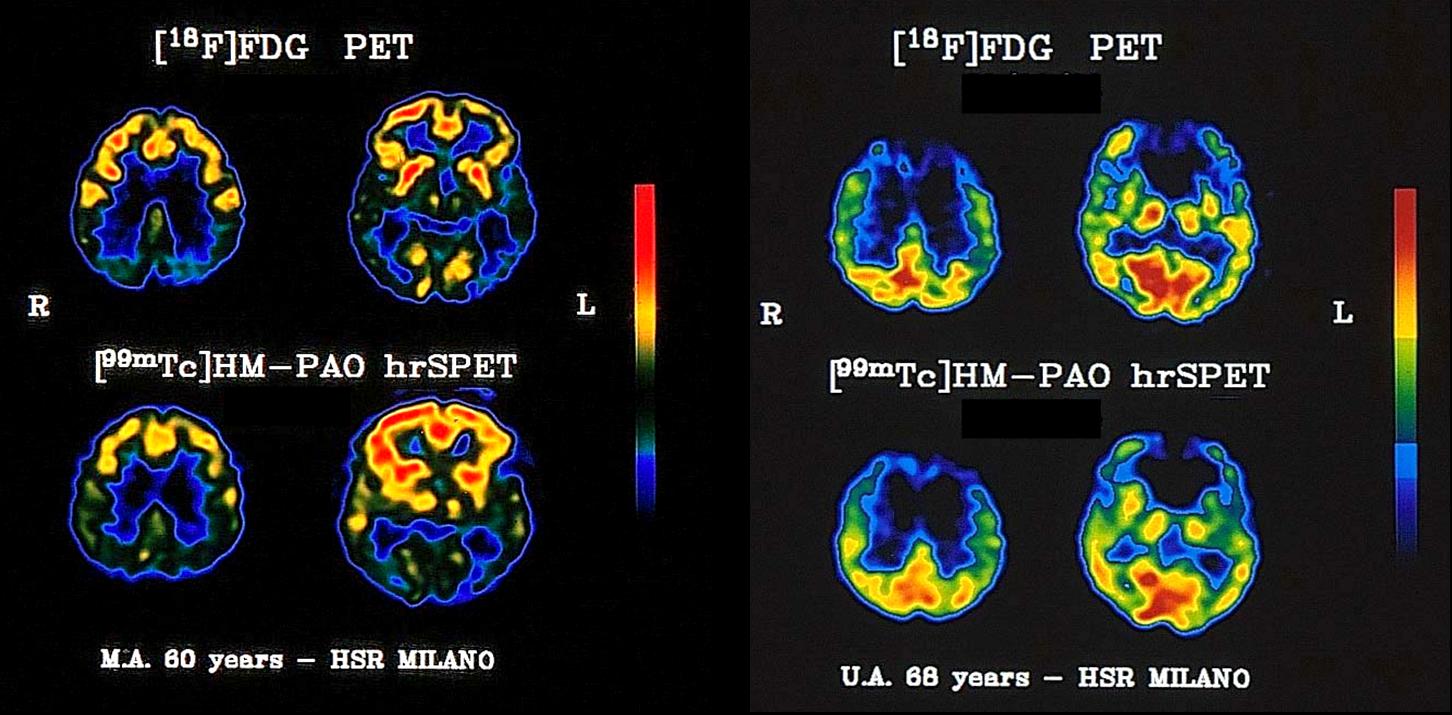 Immagini tomografiche PET (metabolismo di glucosio) e SPECT (perfusione) a due diversi livelli in un paziente affetto da malattia di Alzheimer (sinistra) e in un paziente con demenza frontotemporale (destra)
