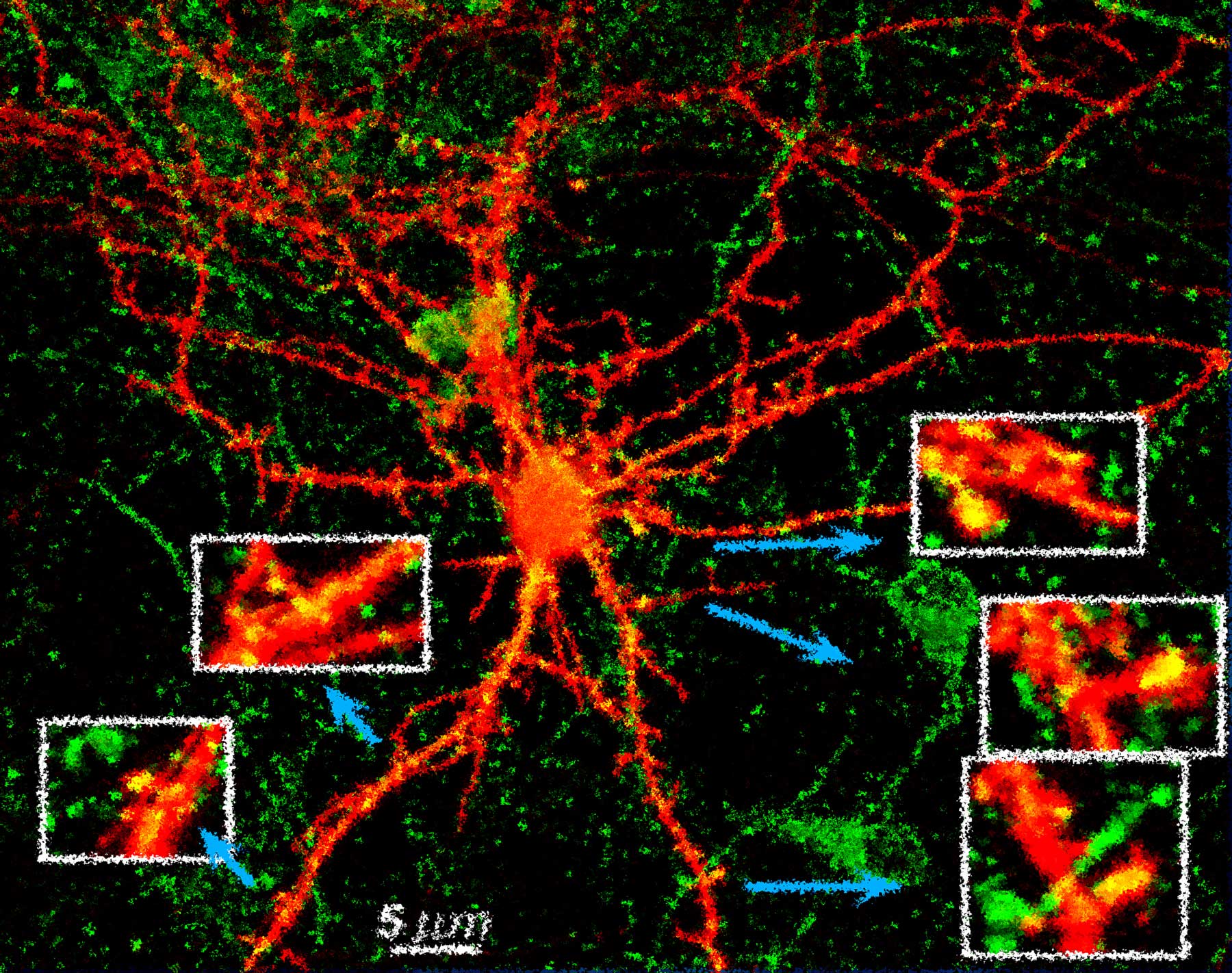 Marcatori proteici rossi e verdi fluorescenti (GFP) di un neurone ippocampale