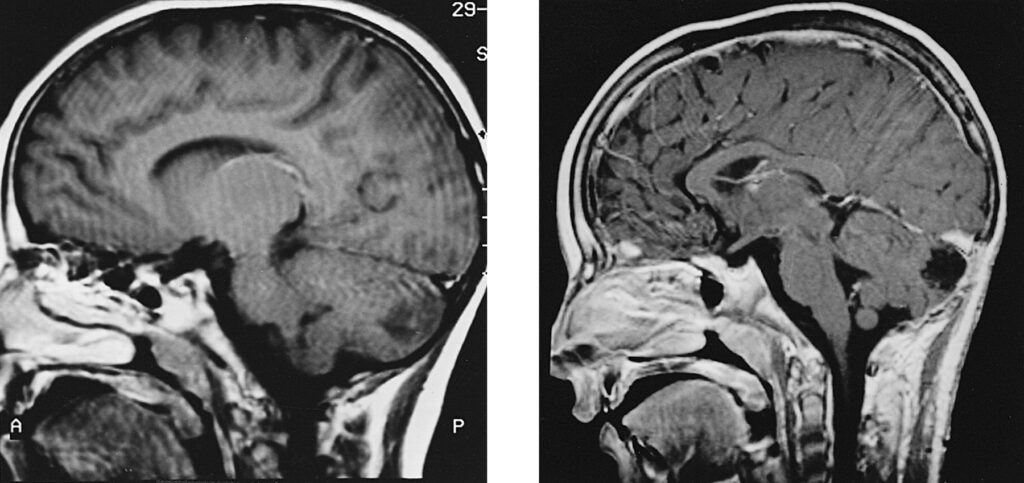 Nonostante il vistoso danno cerebrale, lo sviluppo neurologico è stato relativamente preservato: la paziente infatti presenta solo una lieve spasticità all’emisoma destro, un lieve disturbo dell’articolazione della parola e capacità di comprensione adeguate all’età.