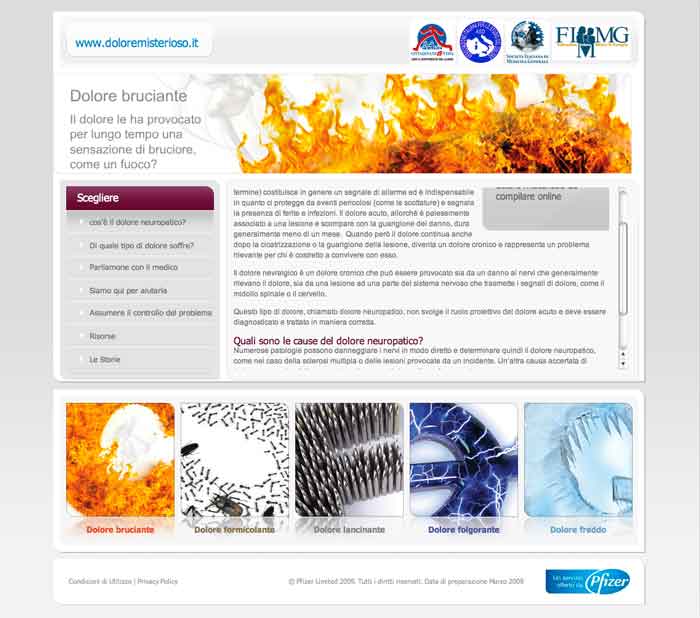 Sono cinque le tipologie di dolore descritte nei materiali: bruciante, formicolante, freddo, folgorante e lancinante. A ogni categoria si associa una descrizione del sintomo e una raffigurazione d’impatto in grado di evocare immediatamente la sensazione descritta: la parola “bruciante” è avvolta dalle fiamme, una striscia di formiche crea la parola “formicolante”, punte d’acciaio acuminate formano la parola “lancinante”, il dolore “folgorante” è raffigurato da lampi e quello “freddo” da ghiaccio. Ciascuno dei materiali verrà poi declinato per pazienti con dolore cronico, con diabete e lombosciatalgia, grazie alla creazione di brochure ad hoc, che danno concrete indicazioni per affrontare la malattia, spiegando come tenere sotto controllo il dolore e come parlarne al proprio medico per trovare il trattamento più adeguato. Sul sito è inoltre disponibile un semplice test che permette di identificare le caratteristiche del proprio dolore, riassunte poi in una scheda da stampare e portare al proprio medico.