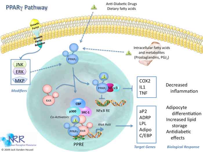 L’obesità, frutto di una dieta ad alto contenuto di grassi, altera la funzione della PPAR-gamma e l’espressione degli stessi geni. Il rosiglitazone e il pioglitazone agiscono legandosi alla PPAR-gamma e contrastando i cambiamenti nell’espressione genica.