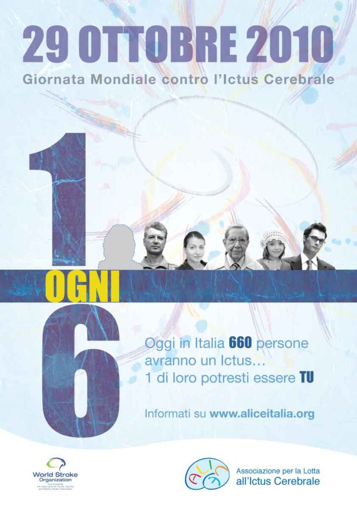 “One in Six”: 1 persona ogni 6 secondi, nel mondo, indipendentemente dall’età o dal sesso, viene colpita da ictus. In Italia, ogni giorno, l’ictus colpisce circa 660 persone. “One in Six” racchiude i concetti chiave della campagna mondiale: la persona colpita potresti essere tu – previeni l’ictus, riconosci i suoi sintomi, assicurati di ricevere le cure appropriate.