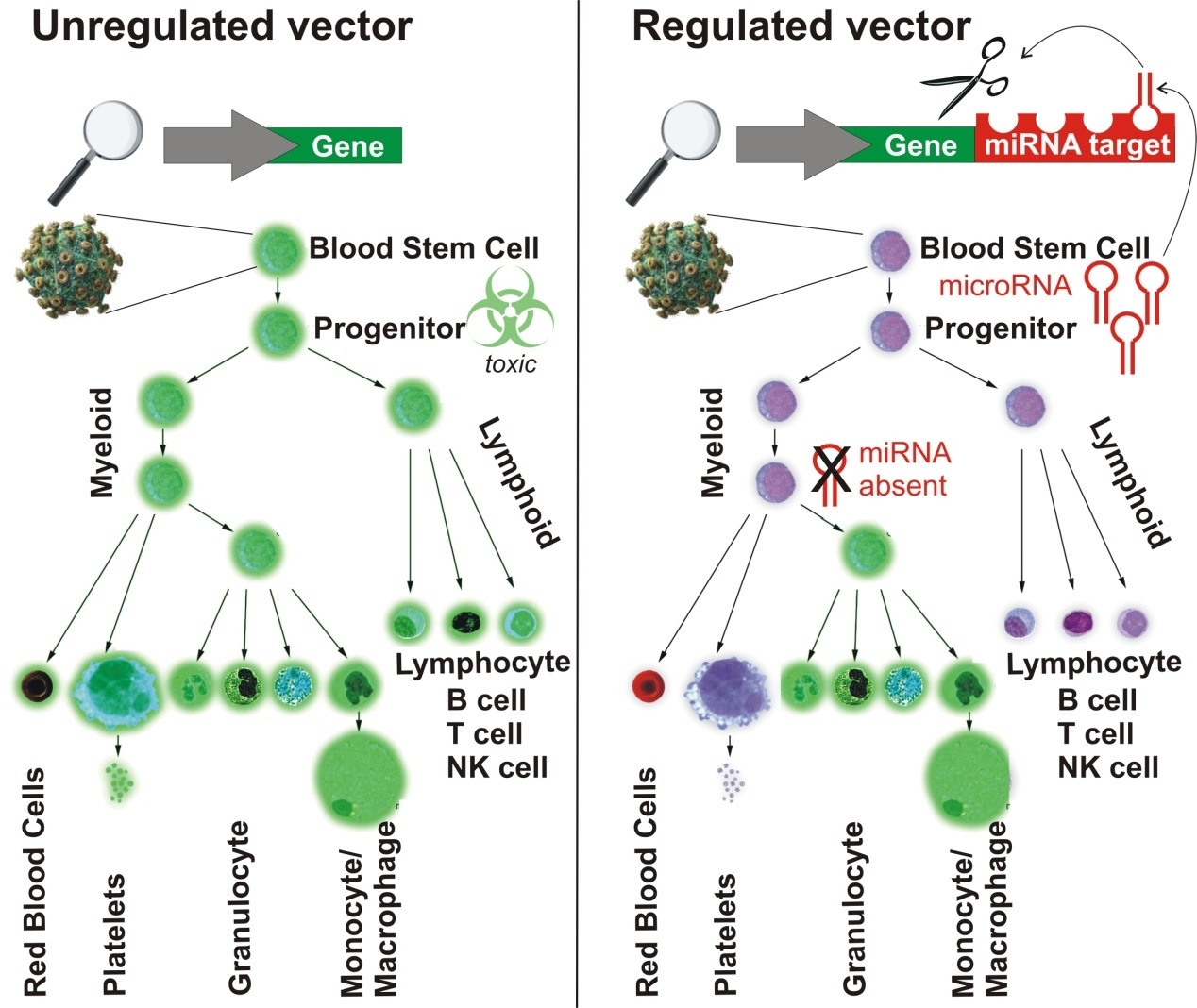 Grazie a un nuovo metodo messo a punto proprio da loro per visualizzare l’attività dei microRna in singole cellule viventi, i ricercatori dell’Hsr-Tiget hanno cercato quali fossero selettivamente espressi nelle rare cellule staminali del midollo osseo e non nella loro progenie in corso di differenziamento. Hanno così identificato per la prima volta dei microRna specifici per le cellule staminali ematopoietiche e inserito il codice a barre riconosciuto da uno di questi microRna in un vettore lentivirale per la terapia genica della malattia di Krabbe, che in questo modo risulta sensibile al silenziamento da parte del microRna.
