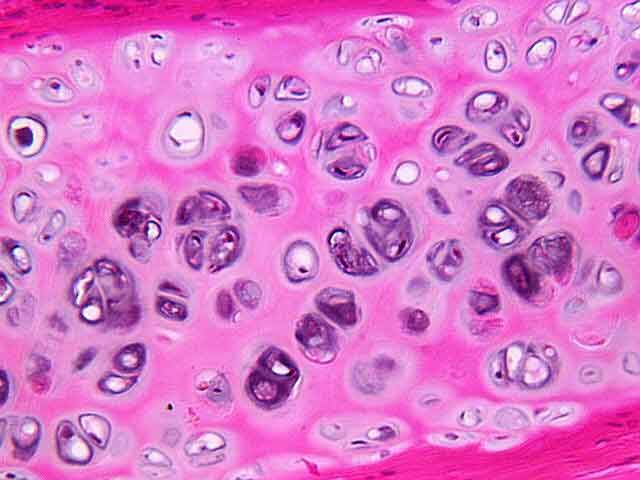 La cartilagine ialina è composta primariamente da condrociti e costituisce la matrice extrtracellulare, lo scheletro dell’embrione e negli adulti riveste le superfici articolari, dove ha la funzione di assorbimento degli urti e di lubrificazione delle superfici a contatto.