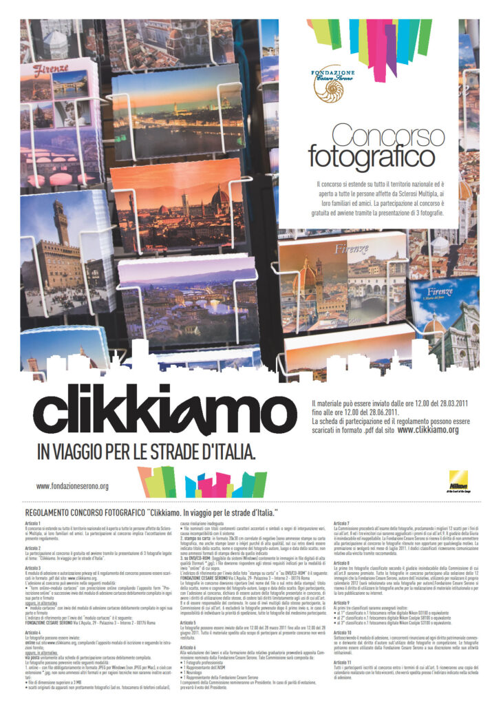 Roma, 1 aprile 2011 – Il ricordo di un viaggio che testimoni la libertà di vivere senza barriere, il viaggio visto come percorso, scoperta, confronto di culture e tradizioni diverse. Queste le ispirazioni del concorso della Fondazione Cesare Serono “Clikkiamo…in viaggio per le strade d’Italia”, destinato ai pazienti affetti da Sclerosi Multipla e ai loro caregiver.