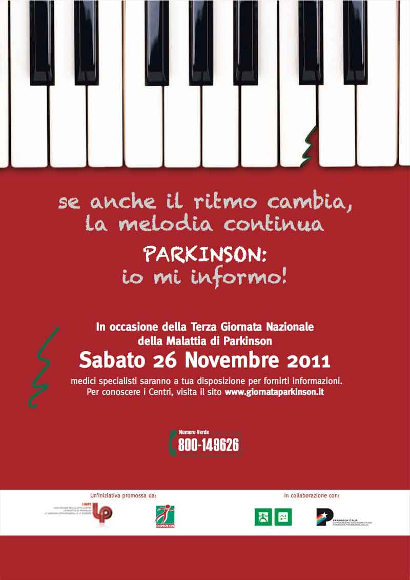 Roma, 23 novembre 2011- È stata presentata oggi la Giornata Nazionale della Malattia di Parkinson che si celebra sabato 26 novembre in tutta Italia – promossa da LIMPE (Lega Italiana per la lotta contro la Malattia di Parkinson, le Sindromi Extrapiramidali e le Demenze) e da DISMOV-SIN (Associazione Italiana Disordini del Movimento e Malattia di Parkinson) da anni impegnate sulla patologia.
