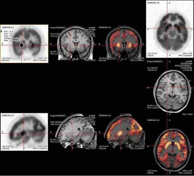 L’immagine PET mostra l’attivazione delle aree cerebrali coinvolte nel risveglio dall’anestesia. A sinistra, le sezioni sagittale (sopra) e assiale (sotto) mostrano l’attivazione della corteccia cingolata anteriore, del talamo e dell’area del locus coeruleus e del nucleo parabrachiale del tronco encefalico. A destra, le immagini dell’attivazione corticale non mostrano alcuna attivazione evidente.