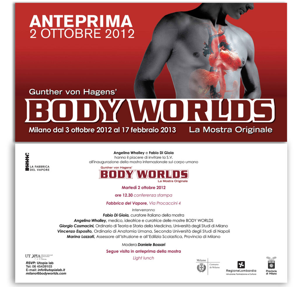 In autunno Gunther von Hagens’BODY WORLDS – il vero mondo del corpo umano arriverà a Milano, prodotta da Arts & Sciences Italy in collaborazione con il Comune di Milano – Cultura Moda Design, allestita presso la Fabbrica del Vapore. Grazie alla tecnica della “plastinazione”, inventata e brevettata dallo scienziato tedesco Gunther von Hagens, BODY WORLDS consente ai visitatori una visione unica e affascinante dell’interno del corpo umano. Il procedimento della plastinazione permette di conservare perfettamente tessuti e organi sostituendo ai liquidi corporei polimeri di silicone.