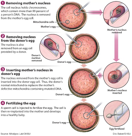 Nella tecnica messa a punto da Mitalipov e colleghi, il materiale genetico cromosomale di un ovocita non fecondato di una paziente con un difetto al mtDNA viene isolato e trapiantato nel citoplasma di un altro uovo enucleato, contenente DNA mitocondriale sano e altri organelli, RNA e proteine, donato da un’altra donna. Un bambino nato a seguito di questa procedura sarà figlio genetico della madre ma porterà i geni mitocondriali sani della donatrice.