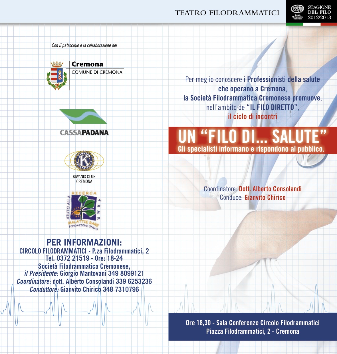 A mettersi in gioco gratuitamente davanti alla platea di spettatori saranno i clinici di Cremona. Altra importante finalità dell’iniziativa è, infatti, far conoscere alla cittadinanza la medicina del territorio, che può avvalersi di risorse e professionisti di ottimo livello. Si inizia venerdì 9 novembre, alle 18:30 con il dr. Alberto Bottini nell’incontro dal titolo “Evoluzione in ambito oncologico”, e un focus specifico sul tumore al seno; la settimana successiva, il secondo appuntamento “Parliamo di diabete: il malessere del benessere”, a cura del dr. Pierangelo Lazzari; il 23 novembre si prosegue con “Rischio cardiovascolare”, insieme al dr. Guido Garavelli; 30 novembre, “Malattia di Parkinson”, con la dr.ssa Francesca Mancini; 7 dicembre, “Dolore non ti sopporto più”, con il dr. Massimo Damini; 14 dicembre, “L’ecografia con mezzo di contrasto”, spiegata dal dr. Giuseppe Voltini. La rassegna continua nel 2013 con tante altri incontri incentrati su diversi temi. Al termine di alcune serate sarà anche possibile degustare un piccolo aperitivo, per continuare la conversazione in un clima ancor più informale e conviviale. Per informazioni sull’iniziativa, le date e gli argomenti dei diversi incontri, i cittadini potranno contattate il circolo Filodrammatici al numero 0372 21519, dalle ore 18:00 alle ore 24:00.