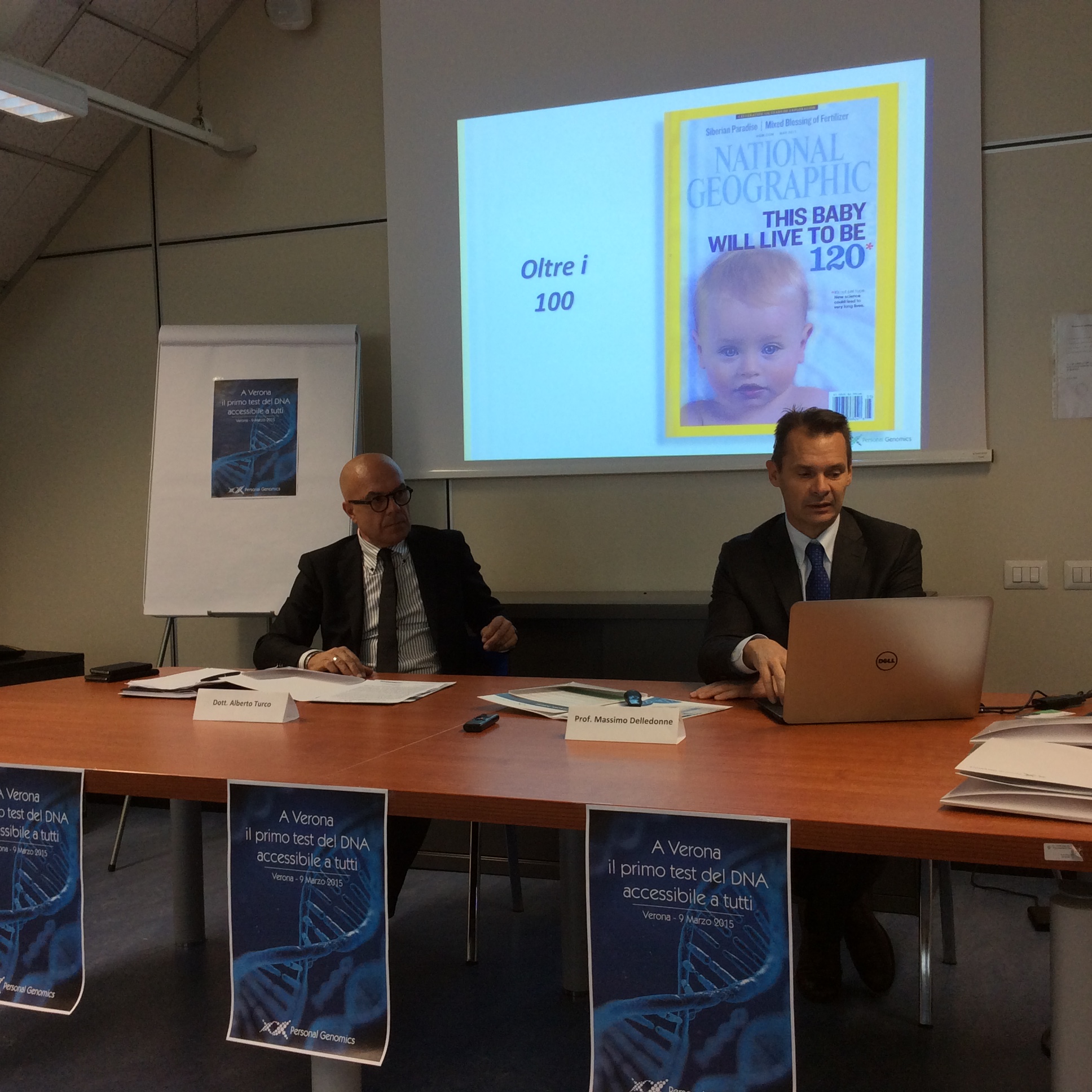 Verona, 9 marzo 2015. Un test del DNA che fornisce, in meno di 60 giorni, l’intero contenuto del proprio genoma da “leggere” e sviscerare in un report scaricabile comodamente sul proprio iPad o su un sito web protetto. Un check-up che si fa una volta e per sempre, a partire da un semplice prelievo di sangue, e che vale tutta la vita. E’ il nuovo servizio (il primo del genere in Italia) da oggi messo a disposizione anche del pubblico da Personal Genomics, spin-off dell’università di Verona nata all’interno del Dipartimento di Biotecnologie. A presentarlo, nei laboratori di Ca’ Vignal dell’ateneo scaligero, sono stati Massimo Delledonne, direttore scientifico di Personal Genomics e direttore del Centro di genomica funzionale dell’ateneo, in cui la spin-off è incubata, e Alberto Turco, genetista medico, direttore della Scuola di specializzazione in Genetica medica dell’ateneo e membro del comitato scientifico di Personal Genomics.