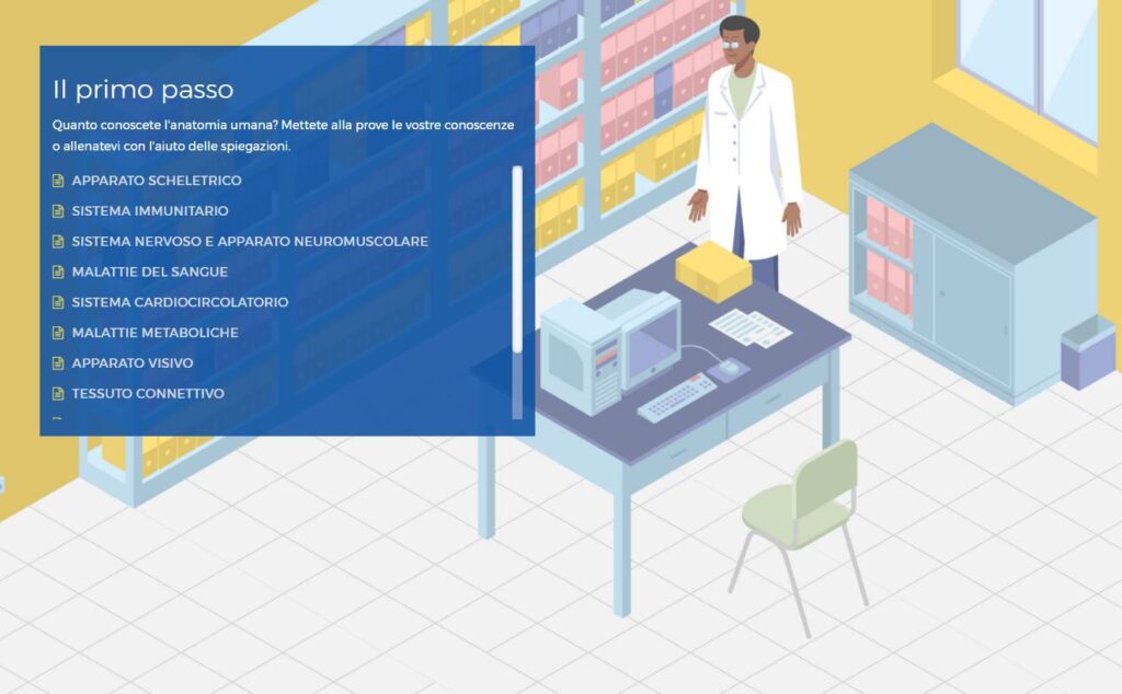 Risolto il quiz, accederanno a una cartella clinica, potranno leggere una breve descrizione dell’anamnesi di un paziente e saranno guidati a individuare i sintomi più rilevanti con l’ausilio degli strumenti di laboratorio per poi verificare la diagnosi attraverso visite e analisi con gli strumenti del laboratorio virtuale. Infine, potranno scegliere la terapia (o la cura, dove, grazie alla ricerca, sia già disponibile) più adeguata tra le varie proposte.