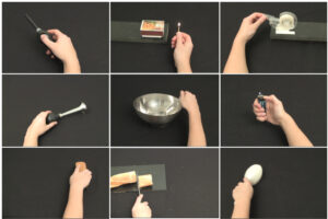 Esempi delle azioni quotidiane osservate durante l’esperimento dai soggetti con il braccio immobilizzato. Foto di Julien Bourrelier (INSERM U1093) e...
